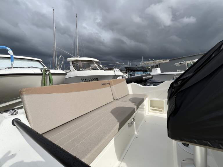 Pacific Craft 670 open (disponible) , coque blanche, leaning post, direction hydraulique Version Trendy, sellerie PVC grey Moteur Yamaha F150 LB – garantie 5 ans. Sondeur GARMIN ECHOMAP ...