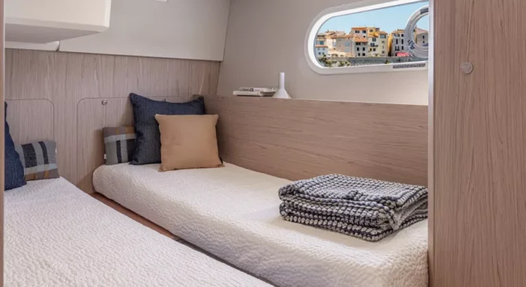 En dessous du pont (pont inférieur), le Swift Trawler 41 propose 3 cabines : une cabine propriétaire à l’avant, une cabine “invités” (avec lit double ou lits jumeaux), et une troisième zone pouvant servir de l’ajuster (lit simple, rangements ou machine à laver).